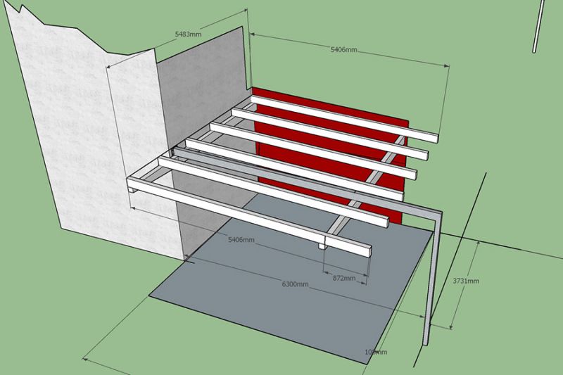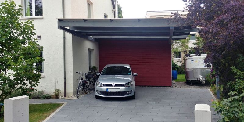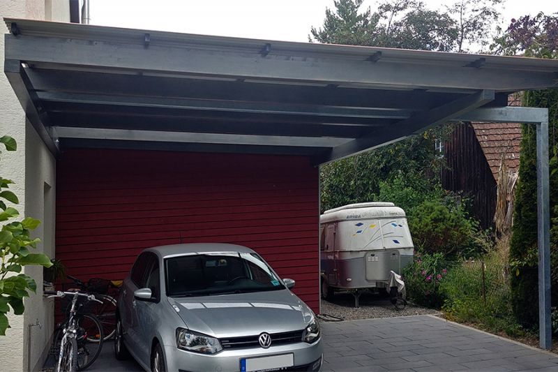 Sogar ein Carport kann ein Hingucker sein, wenn technisch raffinierte Lösungen auch noch gut aussehen. Bei diesem Carport haben wir das leicht abschüssige Dach mit seinen Holzträgern so konstruiert, dass es von vorn betrachtet zu schweben scheint. Der Trick: Ein verdeckter Stahlträger (rechts) nimmt die Dachlast auf.
